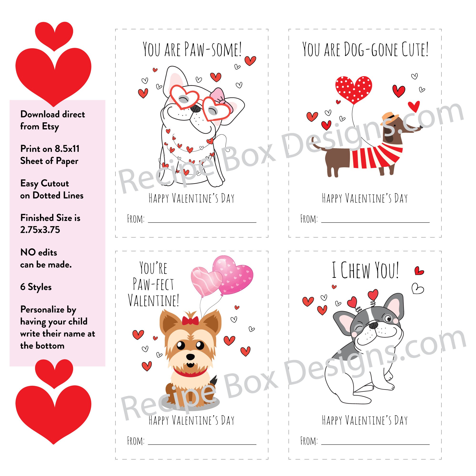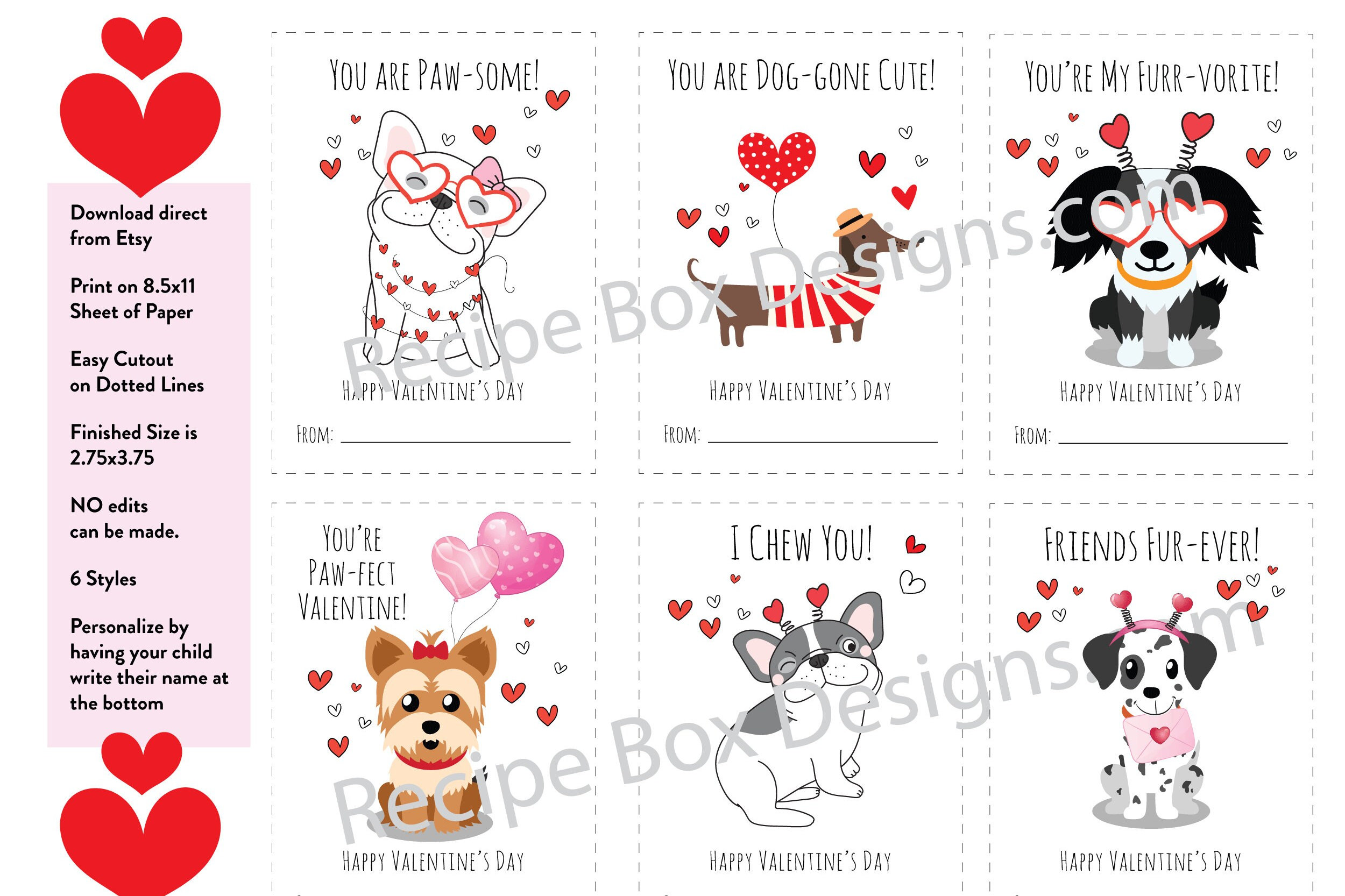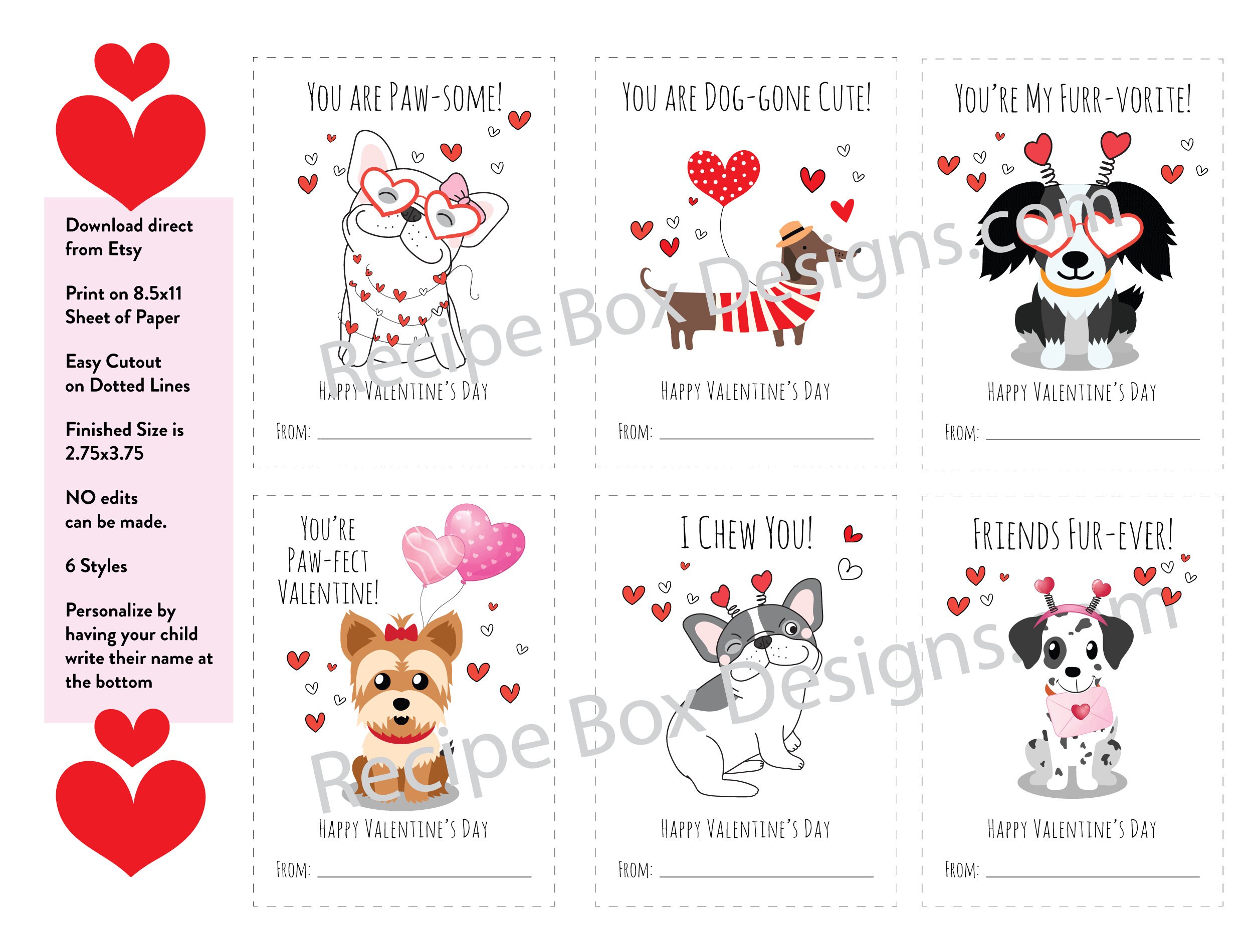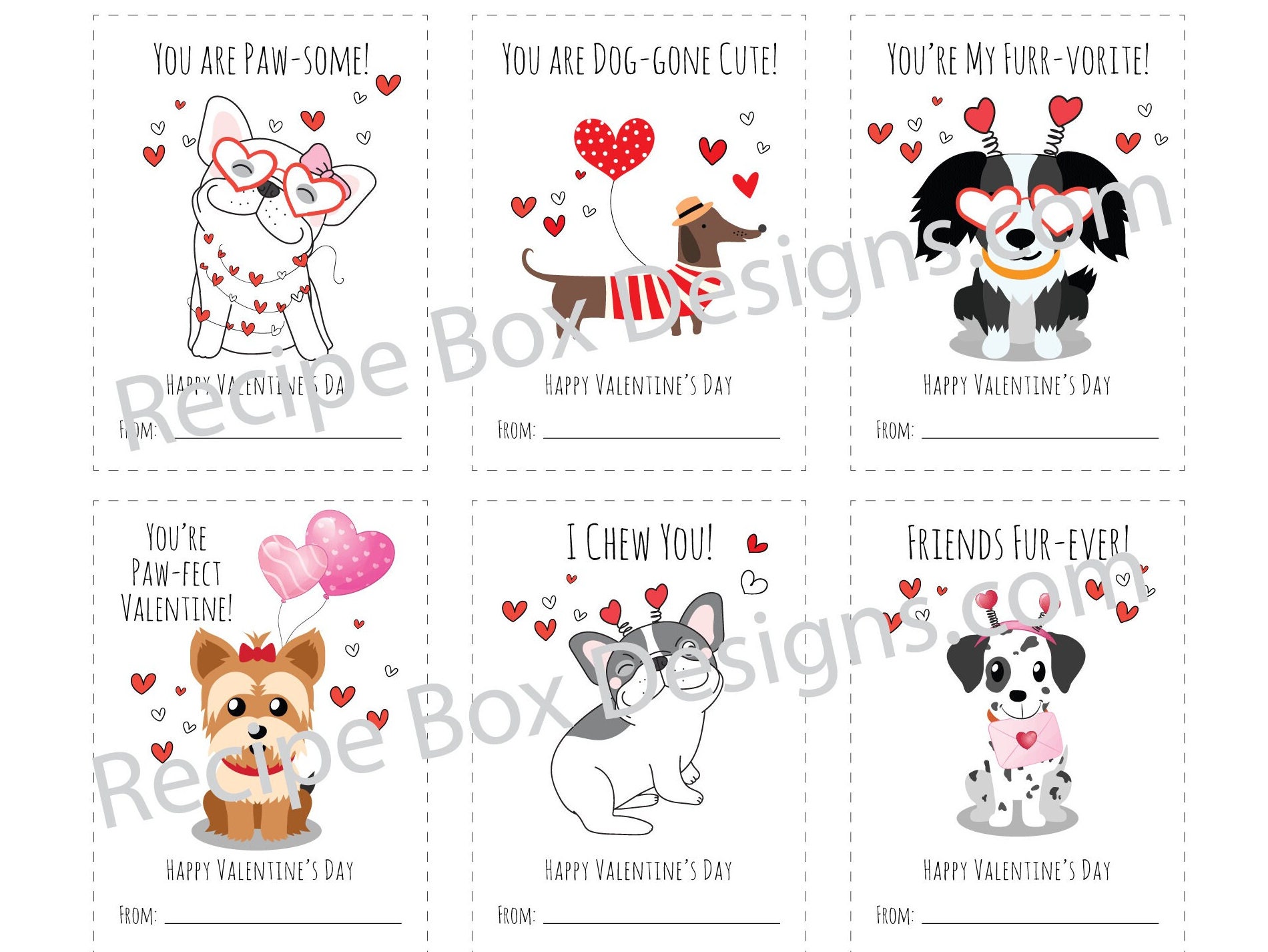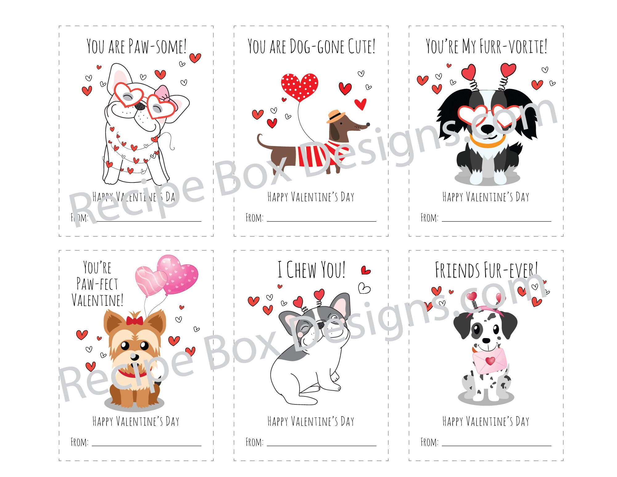 Printable Dog Valentine's Day Cards for Kid's Classroom Valentine's Day card swap. You will get 6 styles on one 8.5x11 sheet.