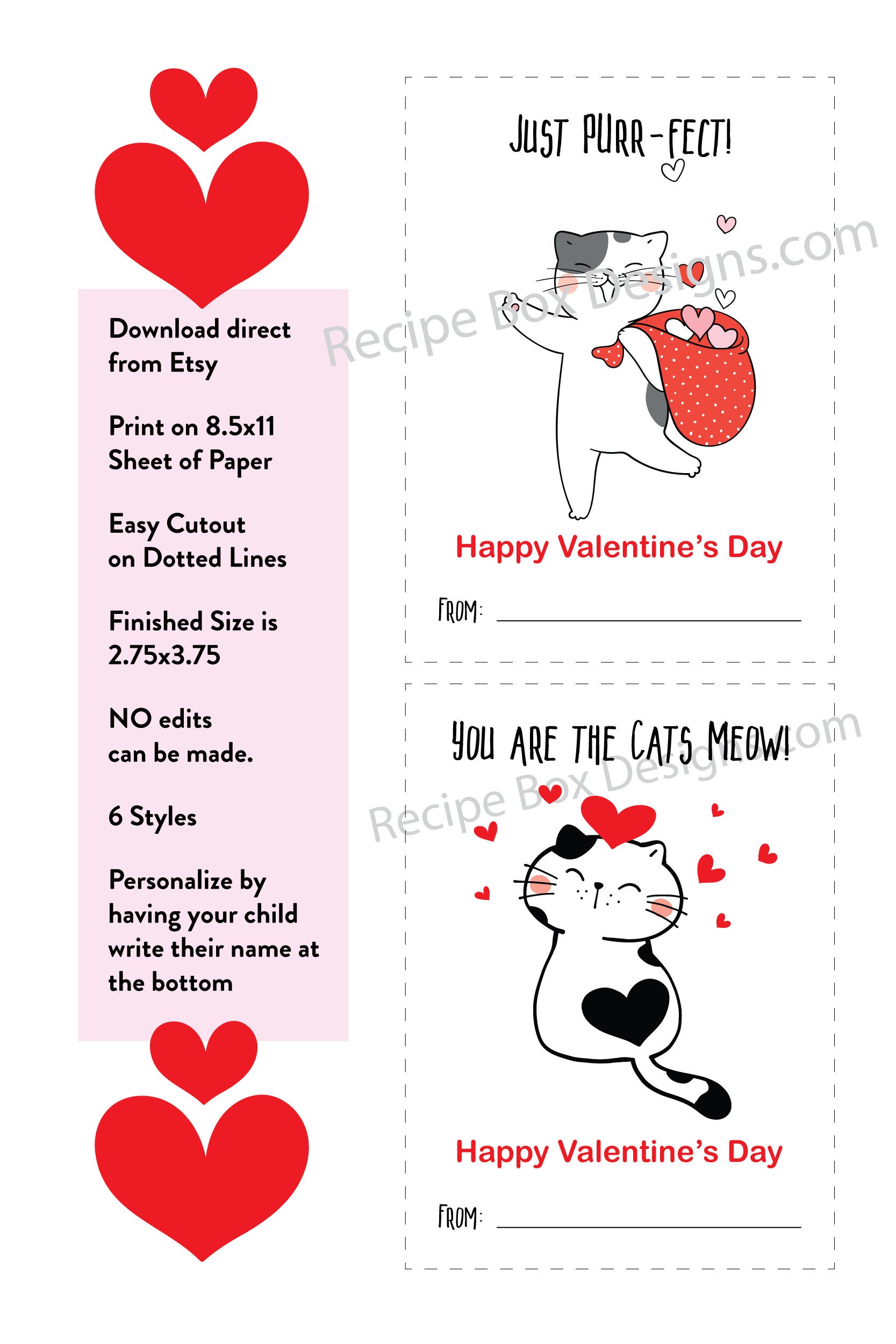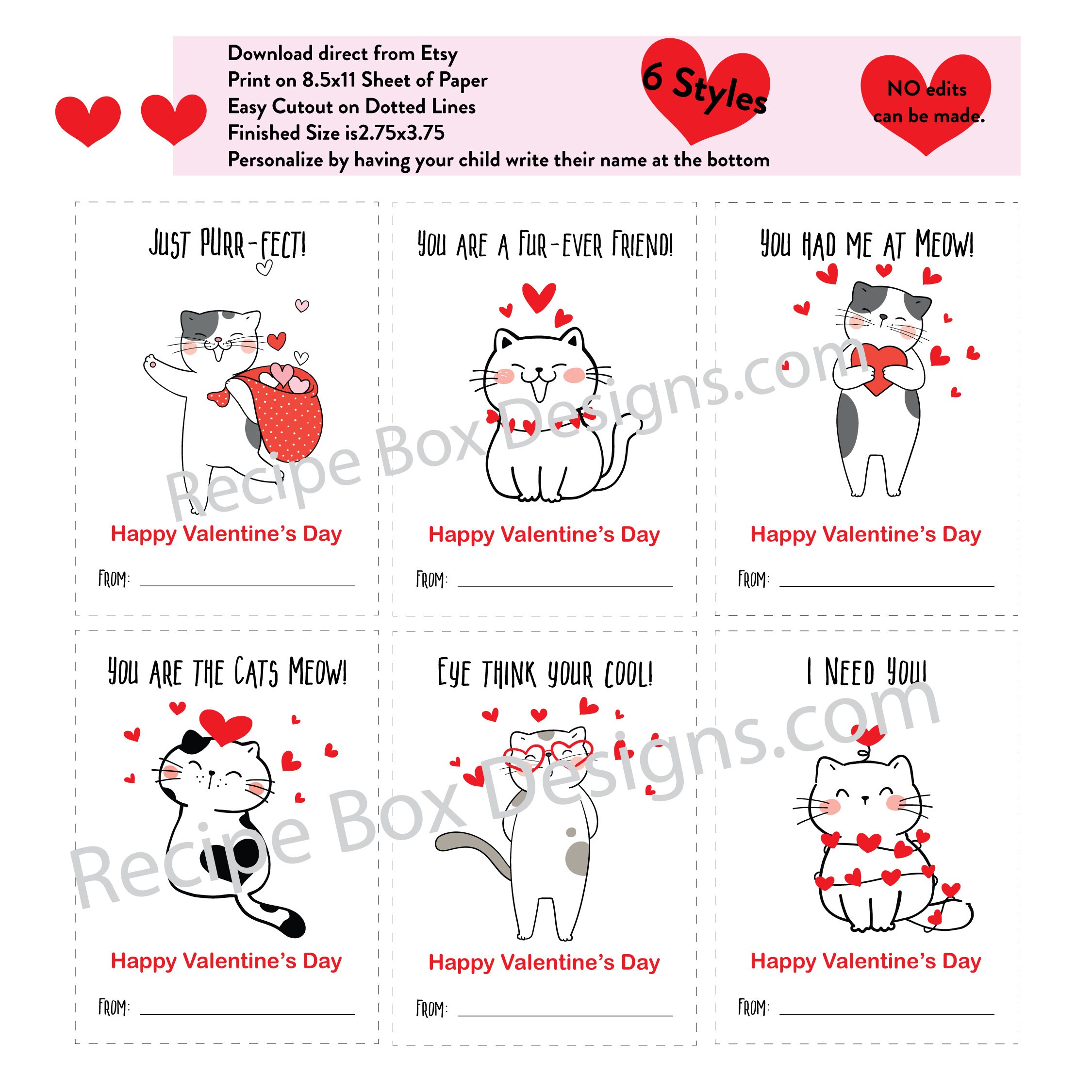Printable Cat Valentine's Day Cards for Kid's Classroom Valentine's Day card swap. You will get 6 styles on one 8.5x11 sheet.