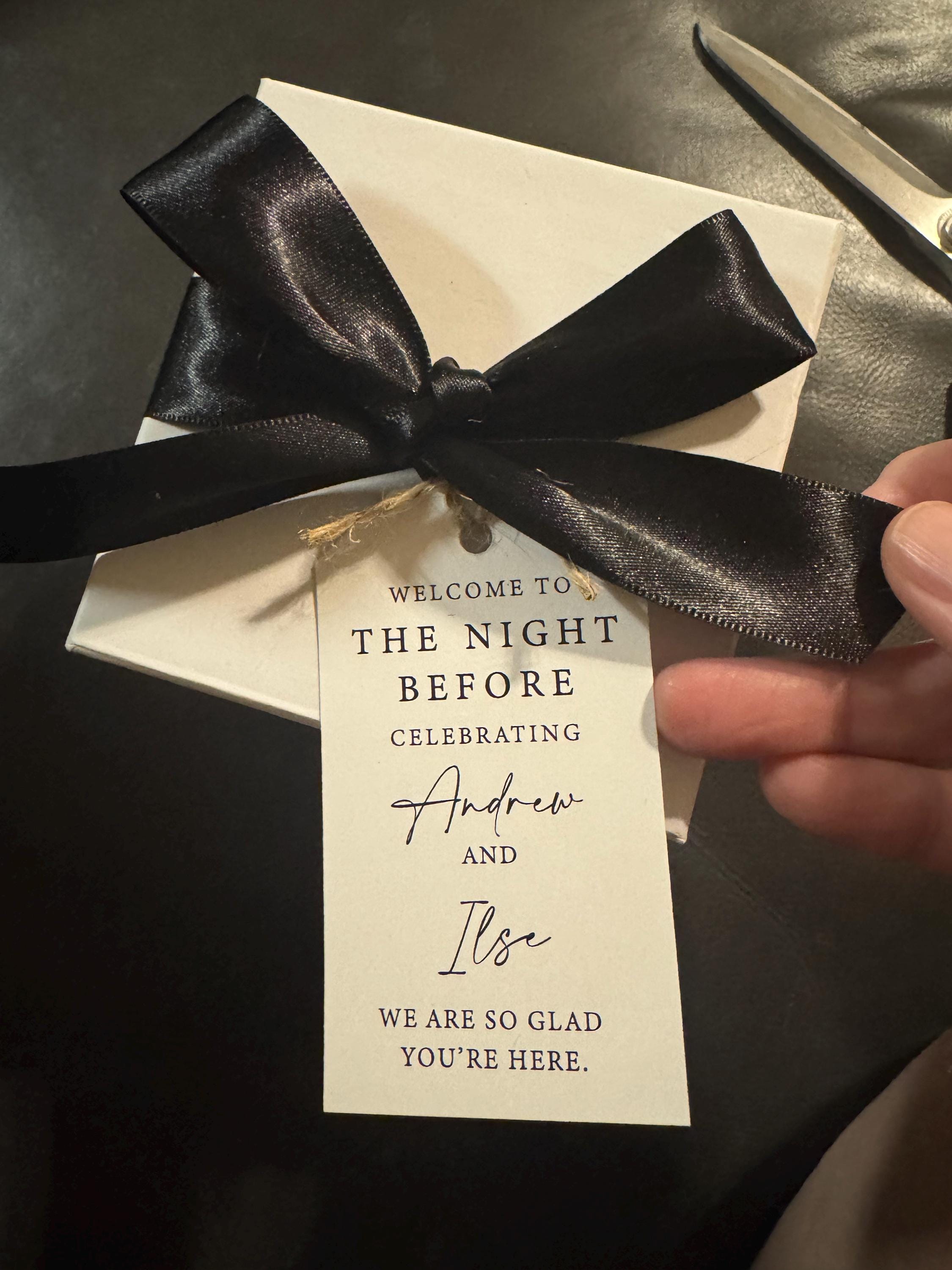 The Night Before Celebrating Tags. Rehearsal Favor Tags, Customized with your names. Tags are 2x3.5 inches with a hole punched. Available with Twine see drop down menu to select that way.