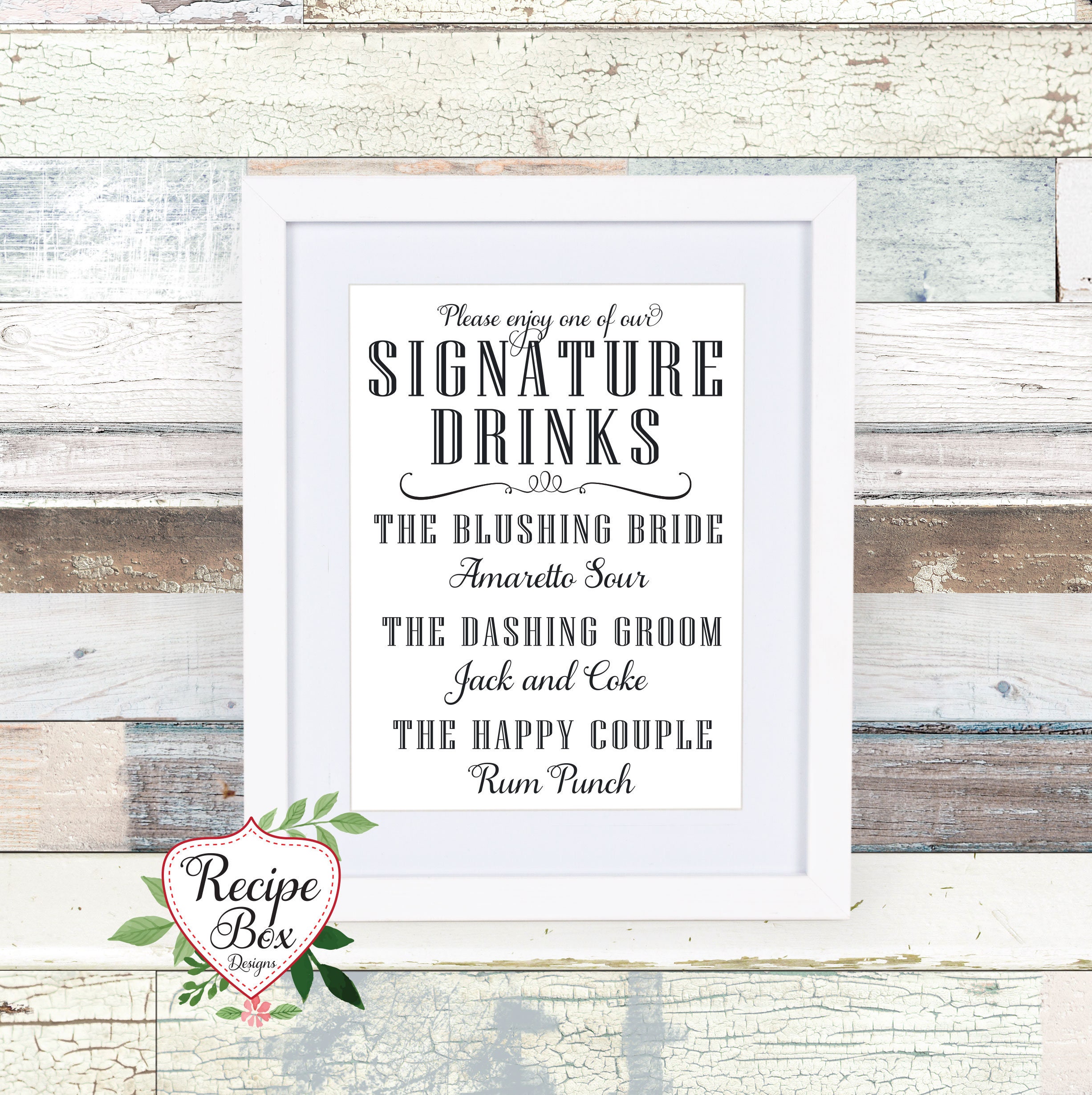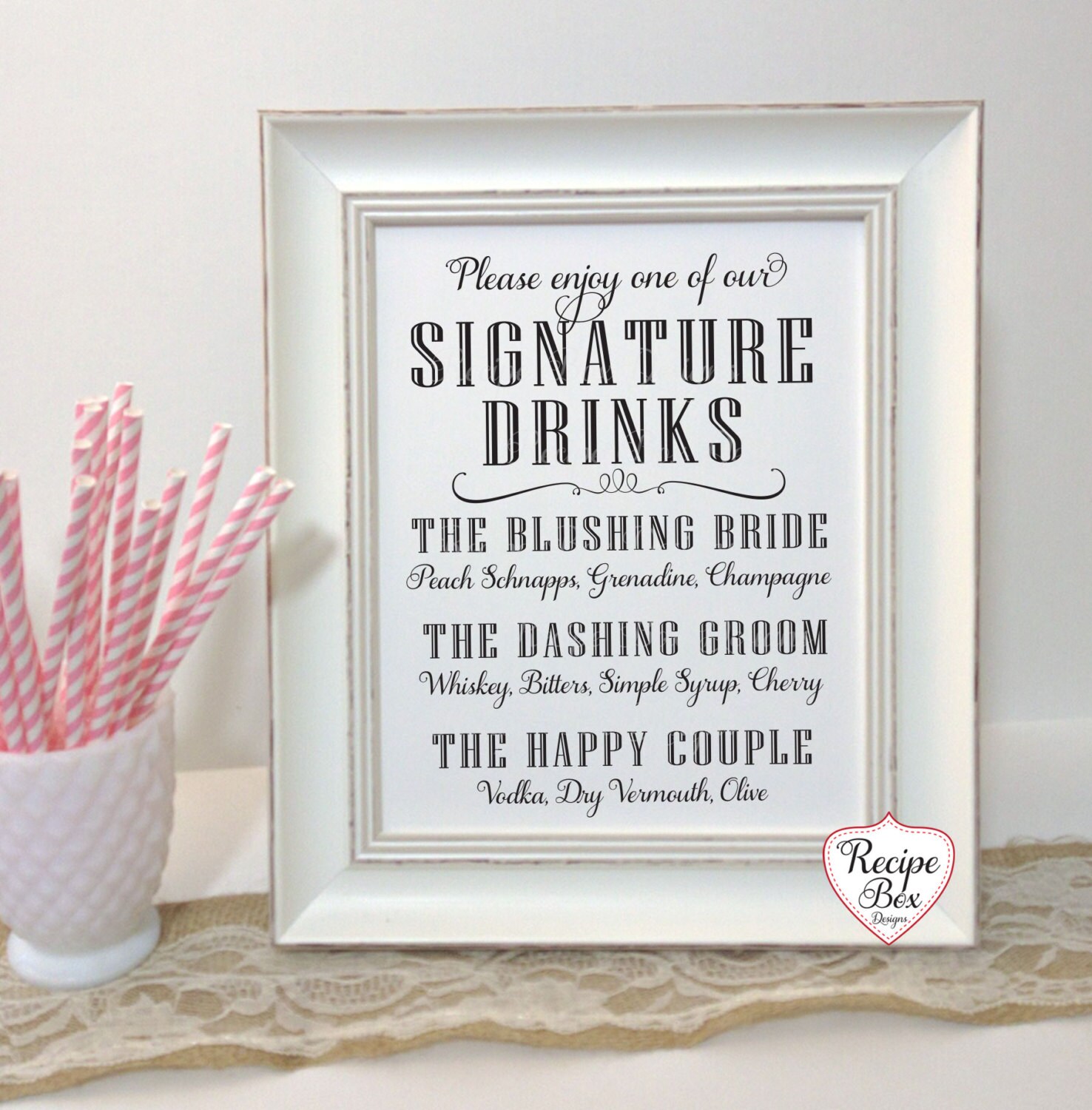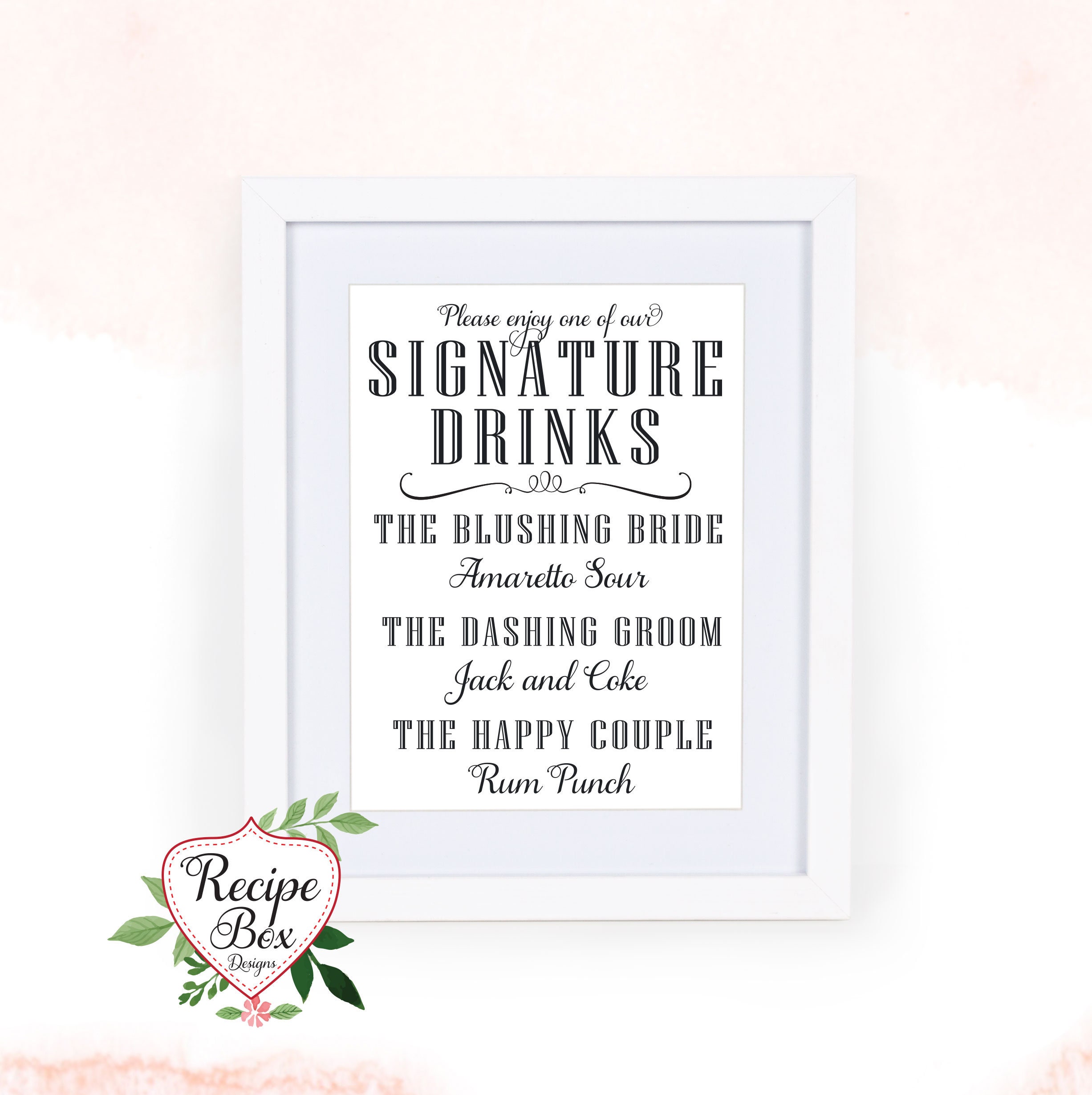 Signature drink sign for your wedding reception. Customized sign with the bride and groom's favorite drink. This signature sign allows your guests to decide their drink selection while standing in line.