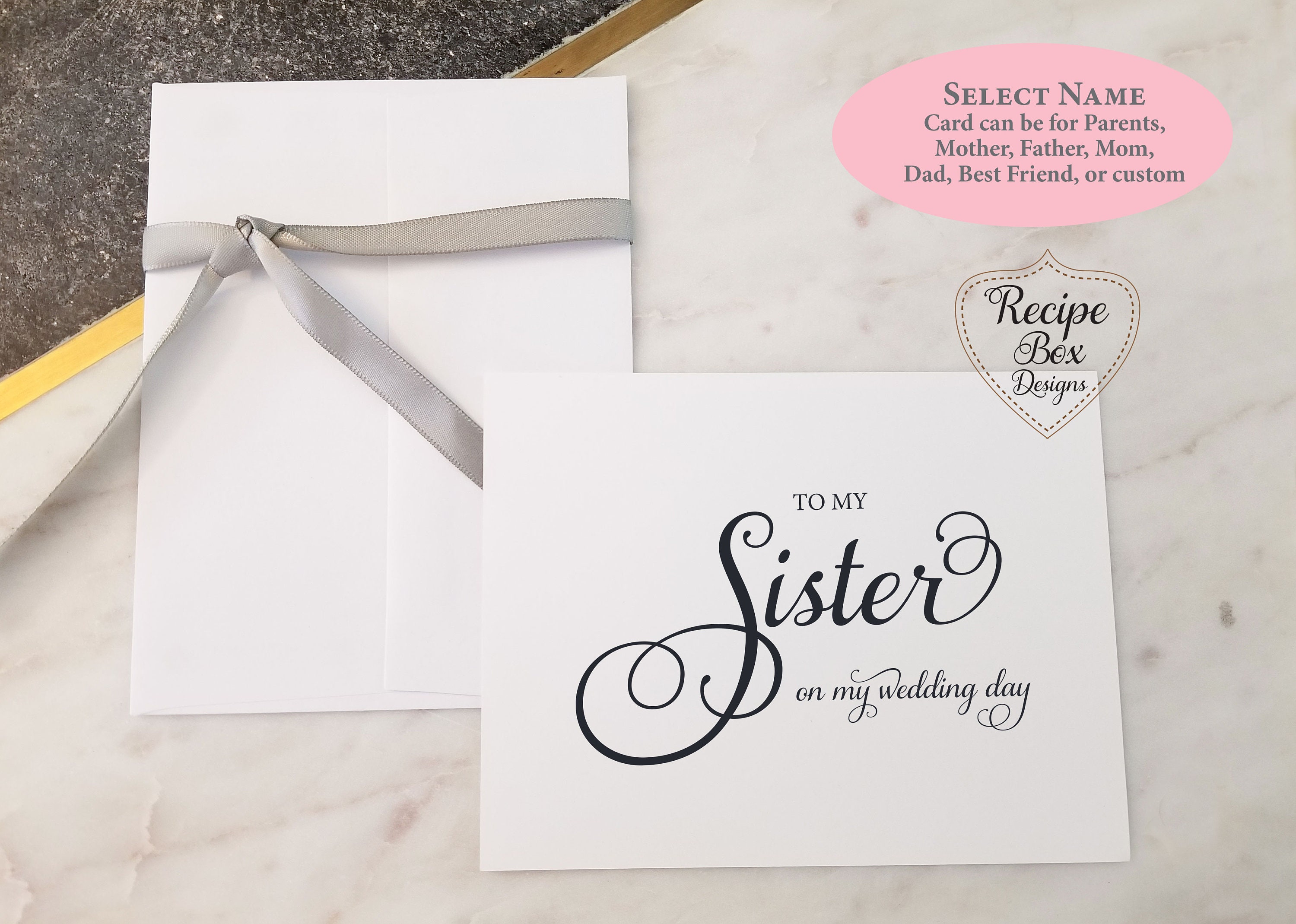 To My Parents on my wedding day is ONE of the choices of card variations; Select who the card is for; Mother and Father Parents Mom and Dad Daddy Mother and Father inlaw Sister Brother Grandmother, other