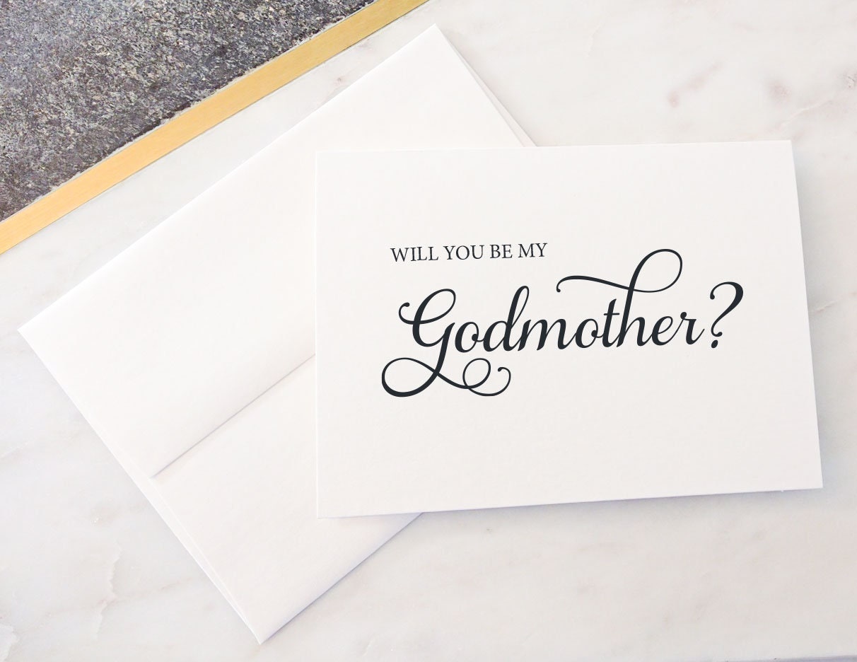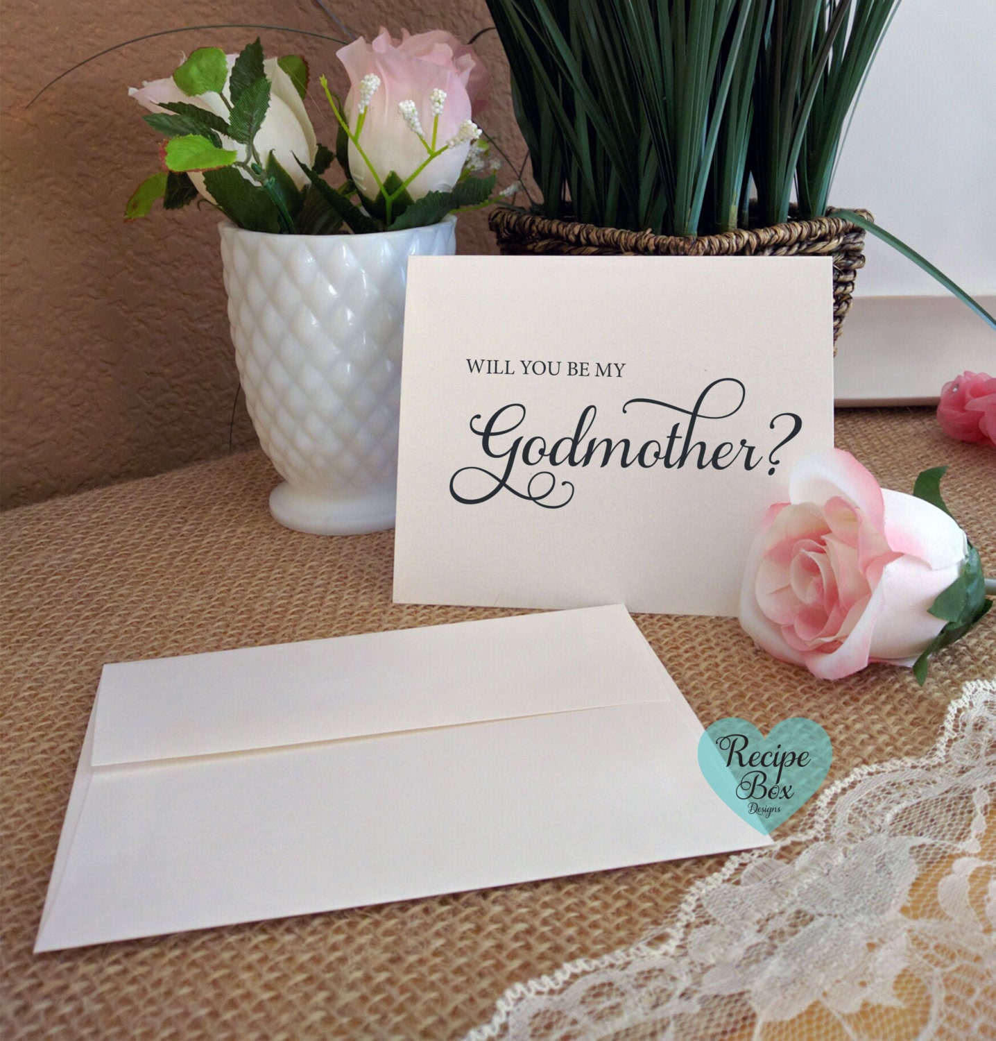 Will you be my Godmother. Your choice of card for Godmother, Godfather or Godparents. This listing is for 1 card. This lovely godparent proposal card has writing is on the front of the card. Nothing is printed inside and is left blank for you to write your own message.
