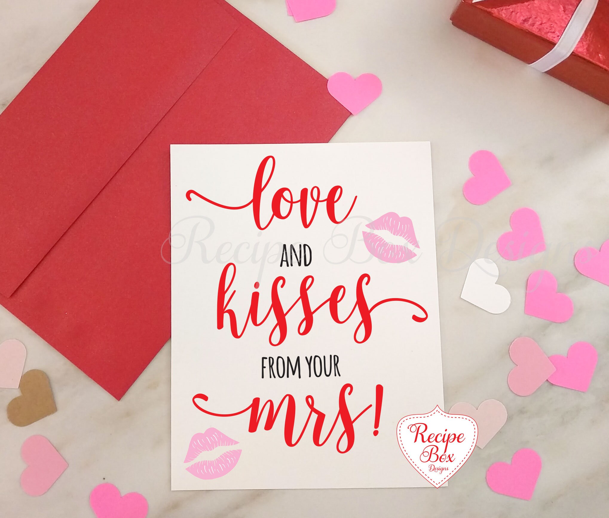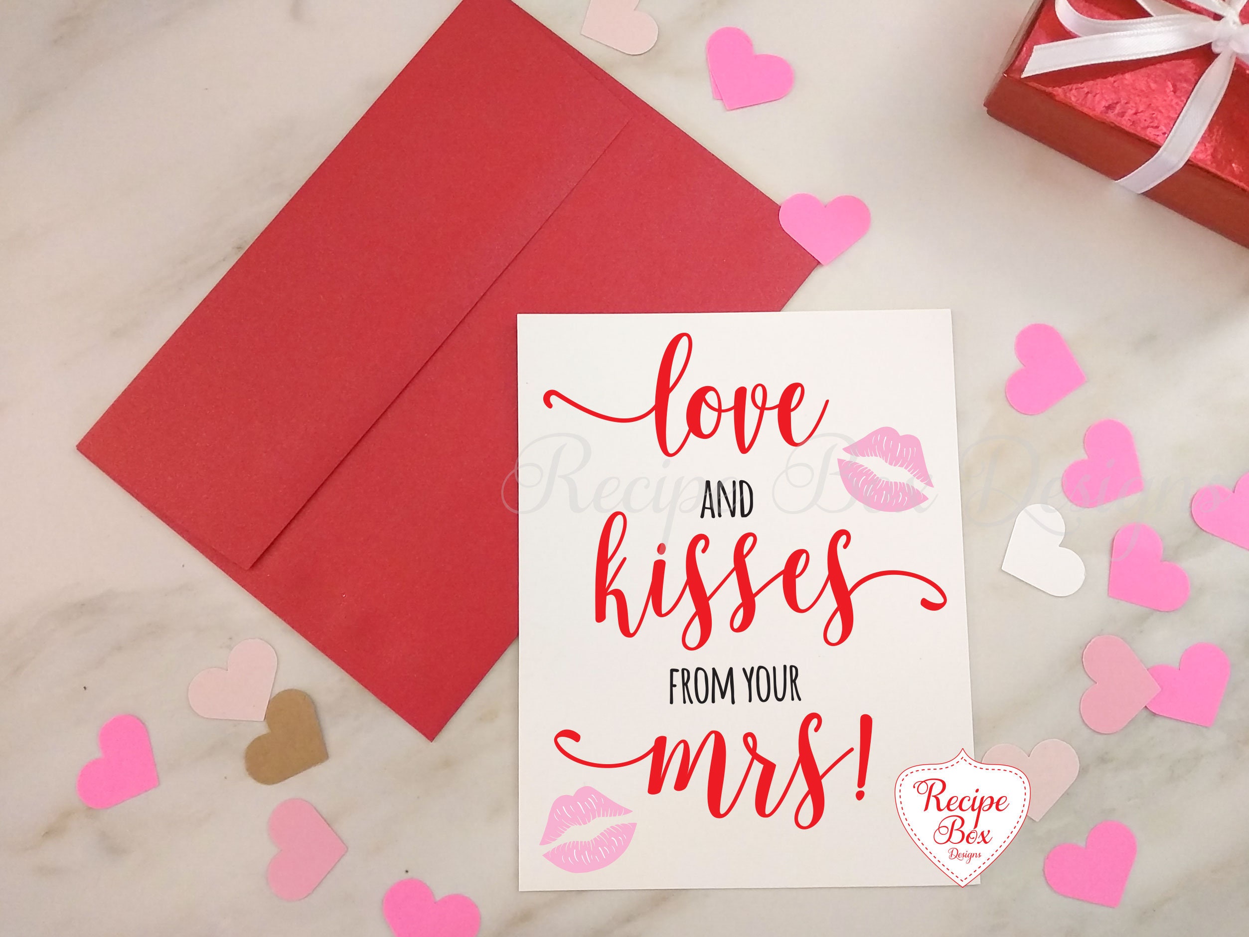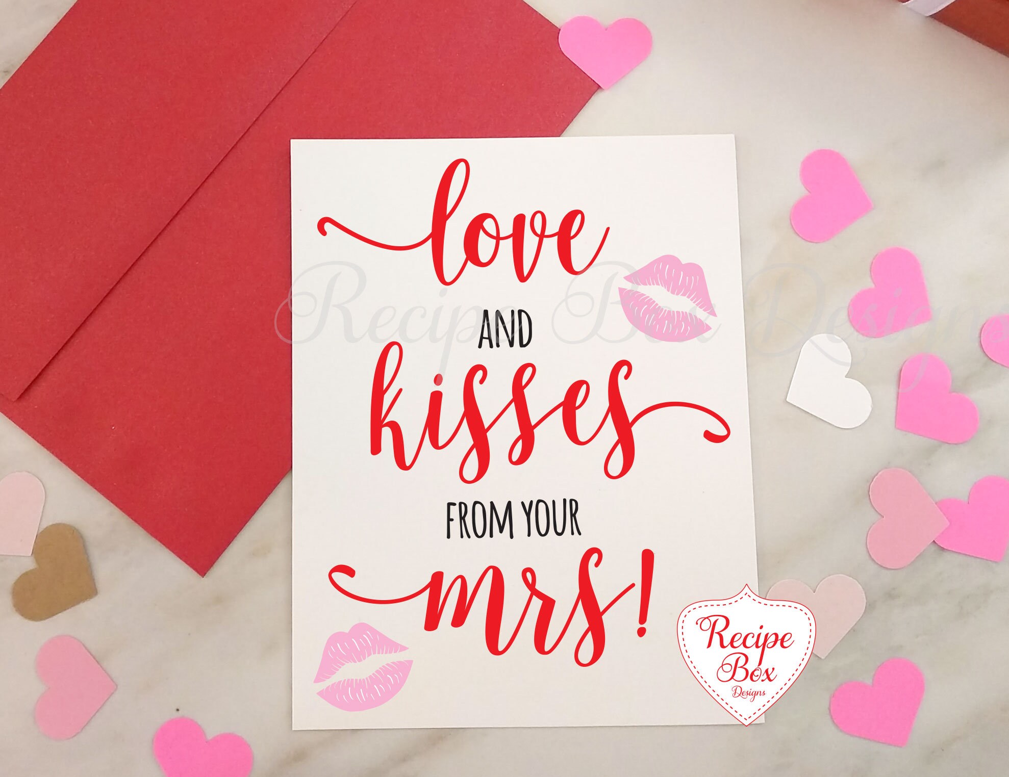Valentine's Day Card with Love and Kisses from your Mrs written on the front. Inside of the card is blank for you to add your own message.